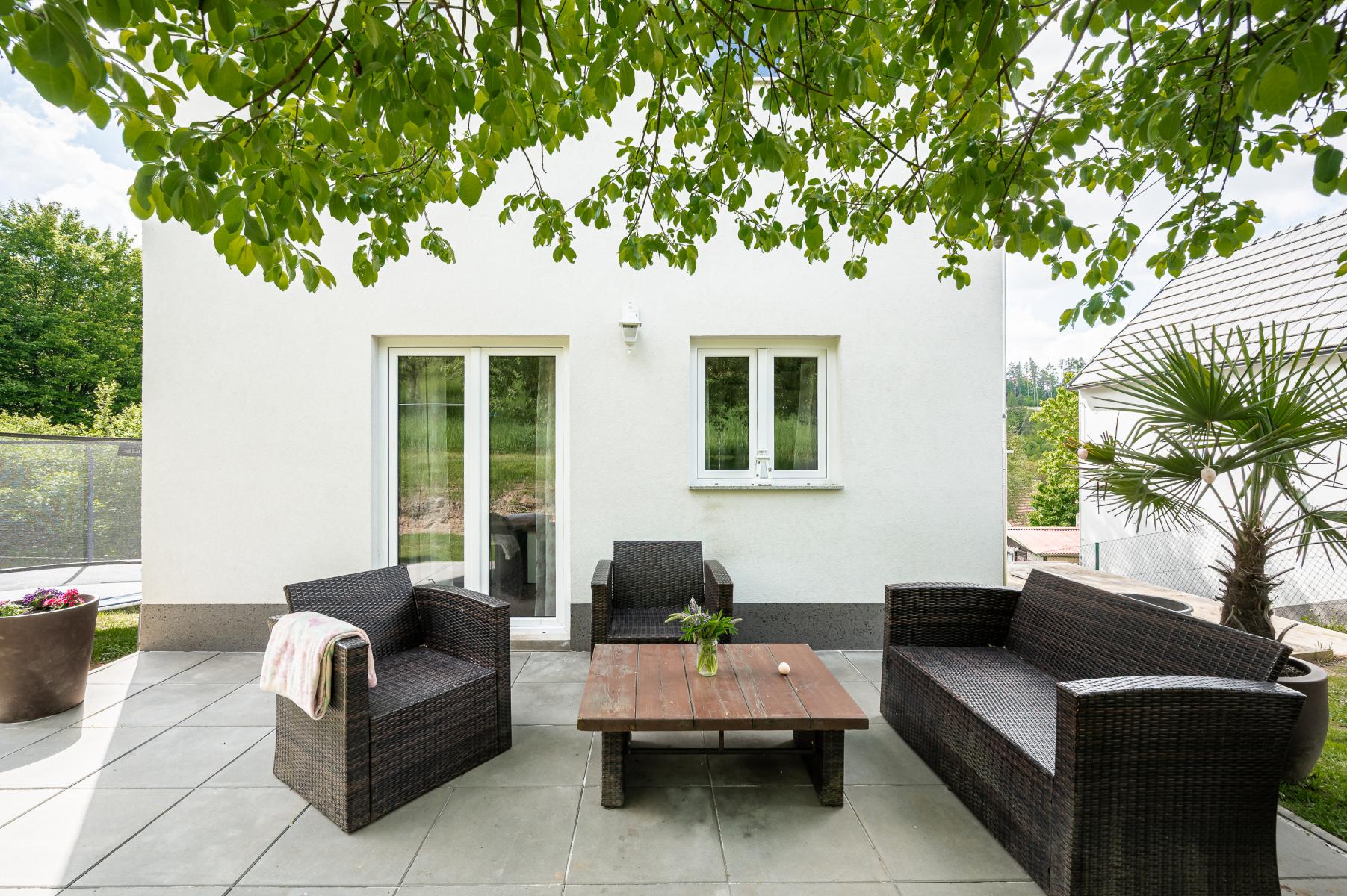 Nabízíme k prodeji samostatně stojící rekreační dům o dispozici 3+kk a obytné ploše 77 m, situovaný na pozemku o výměře 317 m v klidné části obce Mnichovice. Dům byl postaven v roce 2021 a je zasazen do mírně svažitého terénu. Nemovitost má přidělené číslo evidenční. V přízemí se nachází vstupní předsíň, ložnice, garáž/technická místnost a přímý vstup na zahradu. Hlavní obytné podlaží nabízí prostorný obývací pokoj s vybaveným kuchyňským koutem, koupelnu se sprchovým koutem a francouzské okno vedoucí na terasu a zahradu. Podkroví lze využít jako další pokoj či dětský prostor. Mezi hlavní výhody patří klidná lokalita, vlastní zahrada, terasa a dobrá dopravní dostupnost i občanská vybavenost v obci. Nemovitost je vhodná jak k rekreaci, tak i pro celoroční užívání. Přibližně 10 km od domu se nachází nájezd na dálnici D1 s výborným spojením do Prahy i Brna. Nedaleko leží také město Říčany, dlouhodobě hodnocené jako jedno z nejlepších míst pro život v České republice. V Mnichovicích naleznete kompletní občanskou vybavenost a příjemným bonusem je i lyžařský svah vzdálený pouhých 1,3 km. Nemovitost je ihned k dispozici, prohlídky možné po dohodě kdykoliv. Cena je uvedena bez provize. Provize činí 200 000 Kč. Mírná sleva možná.