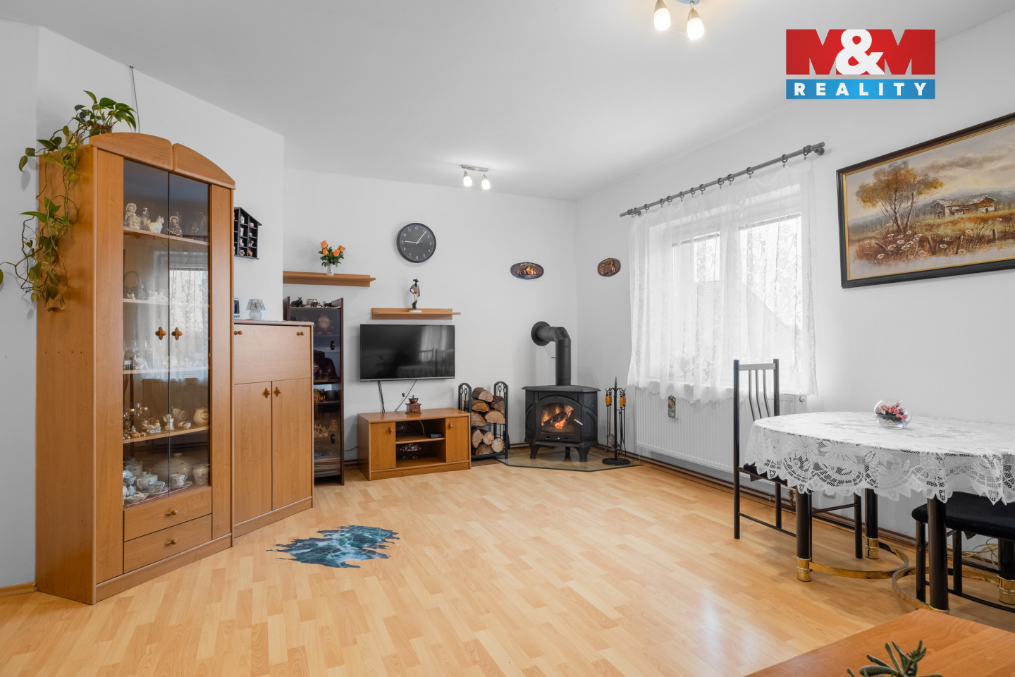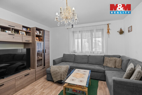 Prodej RD 4+1, 151 m2, s terasou a garáží, ulice V Topolech, Unhošť. Vstupní předsíň s vestavěnými skříněmi, obývací pokoj s krbovými kamny (vložka a…