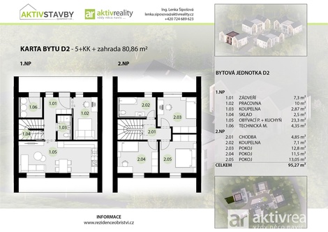 Pokud hledáte nové bydlení nedaleko Prahy s blízkostí k přírodě, jistě vás zaujme nabídka rodinného domu v nově vznikajícím developerském projektu v Obříství - v obci s bohatou historií a stále rostoucí atraktivitou bydlení. Nabízený rodinný dům je situován v rezidenci 12 moderních domů. STAVBA ZAHÁJENA! Duben 2026 - předpoklad výstavby hrubých staveb. Moderní pojetí domu pro každého může znamenat něco jiného a záleží jen na Vašich prioritách, jak si právě z tohoto domu nový domov vybudujete. Dům má k tomu velké předpoklady: - jednoduchý půdorys a linie - trend propojení obývacího pokoje s kuchyňským koutem a jídelnou - použití moderních materiálů - velká okna (přirozené světlo a výhled do zahrady) - propojení s venkovním prostorem (přímý vstup z obývacího pokoje a kuchyně na terasu) - uzavřený komplex zajišťuje bezpečné bydlení nejen pro rodiny s dětmi Dispozice domu 5+kk s parkovacím stáním a předzahrádkou - užitná plocha domu je 95,27 m2 a zahrada má výměru 80,86 m2. Důraz na komfort a maximální využití ploch je patrný v navržených dispozicích: - Přízemí: Prostorné zádveří, technická místnost pro pračku a sušičku, obývací pokoj s kuchyní, spíž, toaleta s umyvadlem, schodiště do prvního patra. - 1.patro: Chodba, koupelna s toaletou, 3 prostorné pokoje s výměrami (11,5 m2, 12,8 m2, 13,05 m2). Moderní design a světlé interiéry Vám poskytnou pocit vzdušnosti a útulnosti, který si zamilujete. S nízkoenergetickým vytápěním pomocí tepelného čerpadla v kombinaci s podlahovým topením ve veškerých prostorách domu a rekuperací nejen ušetříte na energii a finančních nákladech, ale také přispějete k ochraně životního prostředí. Bližší informace naleznete na webových stránkách projektu Rezidence Obříství. Naleznete zde také vizualizace interiérů, půdorysy domů, standardy stavby atd. Zahrada u každého domu poskytne ideální místo k odpočinku, setkávání s rodinou a přáteli., ale i pěstování čerstvé zeleniny, ovoce, bylinek a okrasných květin. Obříství nabízí vynikající dostupnost do větších měst. Obec leží cca 24 km severně od centra hlavního města Prahy a cca 14 km od jeho administrativních hranic. Bližší souvislost a provázanost má území obce se sousedním městem Neratovice (cca 5 km), dále s bývalým okresním městem Mělníkem (cca 8 km) a hlavním městem Prahou, se kterými je obec spojena silnicí I/9 z Prahy do Mělníka. Nadšenci pro cyklistiku a pěší turistiku tu budou v ráji. Nedaleká cyklostezka, volnočasové prostory na břehu řeky Labe (workoutové hřiště), bohatý kulturní život obce - to vše zvyšuje atraktivitu této nabídky. Nezmeškejte příležitost koupě tohoto místa pro spokojený život s veškerou potřebnou občanskou vybaveností. Pro jakékoliv doplňující informace nás neváhejte kdykoliv kontaktovat. Ráda se s Vámi sejdu a probereme vše potřebné.